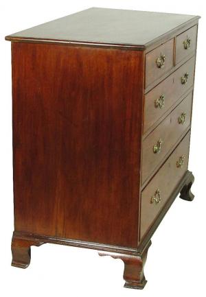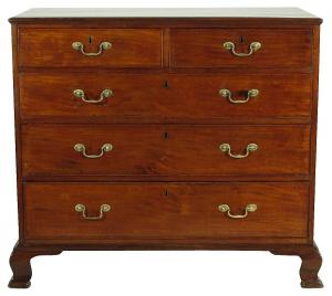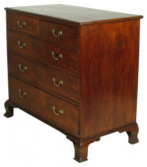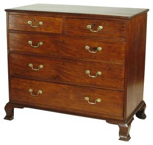 An 18th-C. American Chippendale mahogany chest with two short drawers over three long graduated drawers, solid brass pulls, and rich original patina. 40.5" L x 21.0" D x 36.5" high.