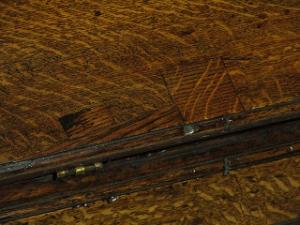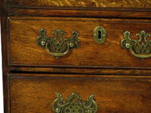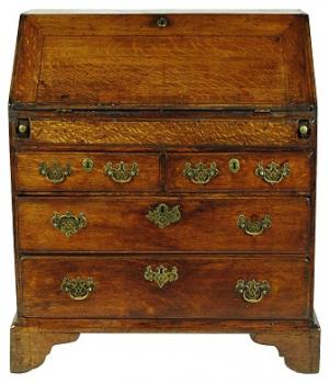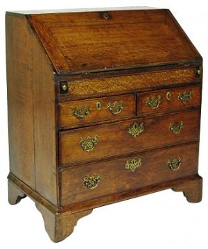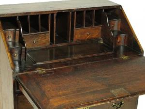 An 18th-C. English George II oak slant-lid desk with a fitted writing compartment over two short drawers over two long drawers. The fitted writing compartment features multiple cubbies and drawers. 31.0" L x 21.0" D x 37.0" high. Writing surface, 27.0" high.