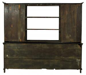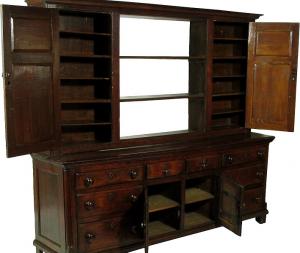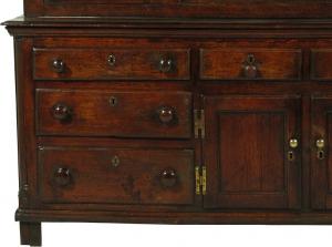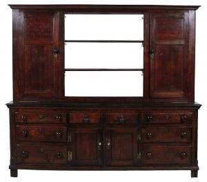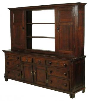 An 18th-C. Welsh oak cupboard with a lower section featuring central drawers over a doored compartment, all flanked by six drawers. The upper section features a central plate rack flanked by paneled door cupboards. Upper and lower sections separate quickly for easier transport. 84.5" L x 21.0" D x 75.25" High. Upper section, 9.25" D..