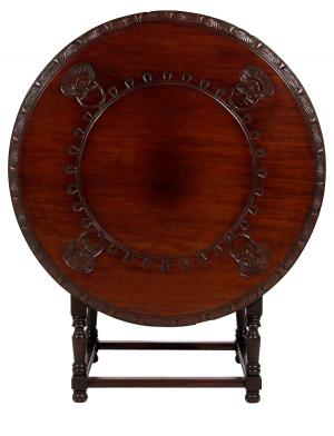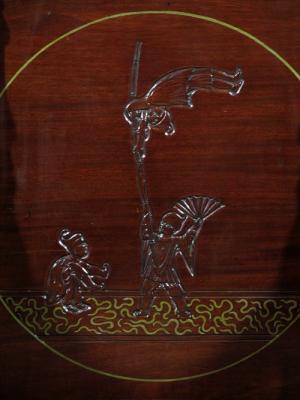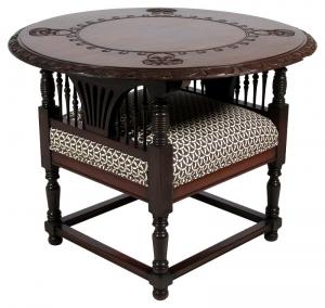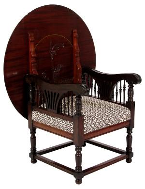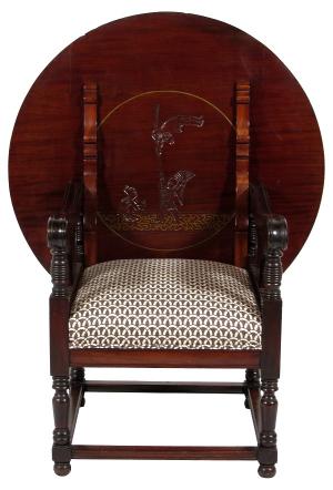 An early 20th-C. American mahogany Aesthetic Movement table-chair with extensive hand carved detail, brass inlay, and new Lulu DK, N.Y. contemporary printed linen fabric. Carved figures on the top are stylized Asian circus performers.