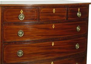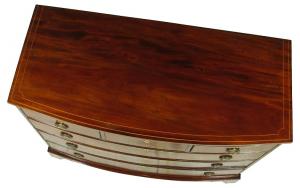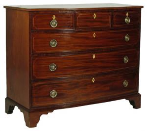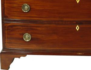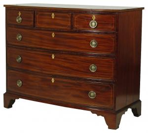 An early 19th-C. American Federal inlaid mahogany bowfront chest with three short drawers over three long graduated drawers, holly string inlay throughout, bone keyhole escutcheons and solid brass drawer pulls. 49.0 L x 22.25" D x 39.0" high.