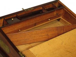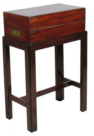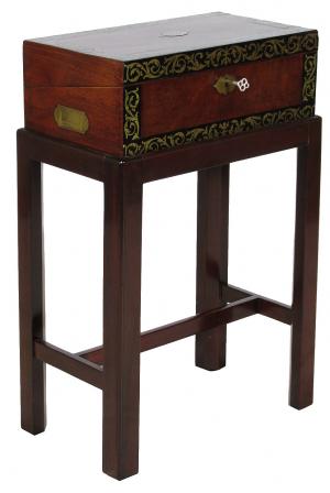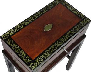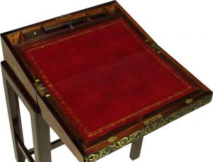 A 19th-C. English Regency lap desk on a later custom mahogany stand with brass decorative inlay on ebony banding, fitted interior, tooled red leather writing surface, and secret compartment. Lid functions with a keyed lock. Key provided.