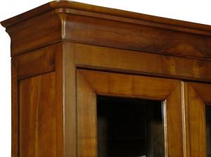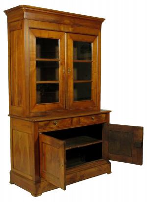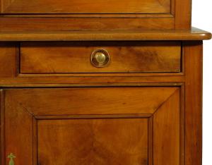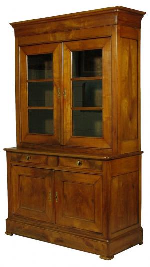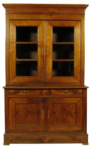 An early 19th-C. French Charles X two-part cherry hutch. The upper section features glazed doors, which open to reveal two removable shelves. The lower section features two short drawers over tow paneled doors, which open to reveal a single removable shelf. Upper and lower sections separate quickly for easier transport. 53.25" L x 23.5" D x 88.5" high.