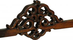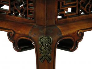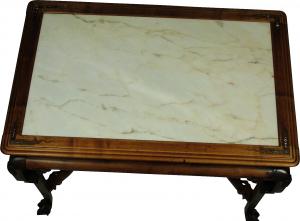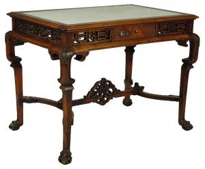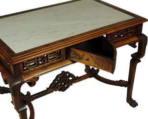 A late 19th-C. English Chinoiserie hand carved walnut writing table with a marble writing surface, a swing drawer on each working side, bronze leg mounts, and mother of pearl inlay. Aprons, 24.0" H. 26.0" L x 40.0" W x 29.5" High.