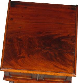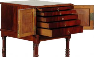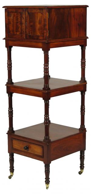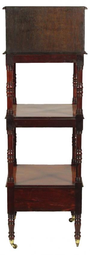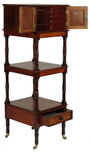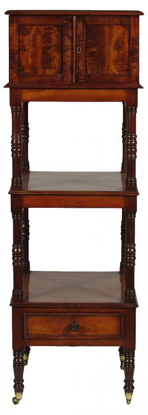 A 19th-C. English William IV flame mahogany etagere with original brass casters, and a doored compartment with five graduated jewelry drawers over an open medial shelf and open lower shelf with a frieze drawer. 17.0" W x 16.0" D x 48.0" high.