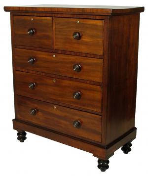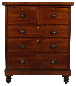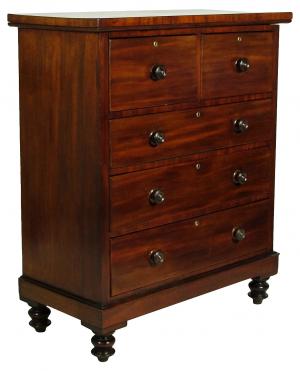 A 19th-C. Scottish mahogany gent's chest with two short drawers over three long drawers, original Sedgwick knobs, and rich original hand polished patina. Constructed with the typical superior standards of the 19th century to include hand-cut dovetails and the use of solid mahogany for interior components.