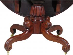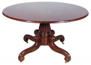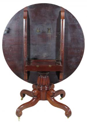 A 19th-C. English William IV mahogany tilt-top breakfast table with hand carved pedestal base and rich original patina. Many tables of the 18th and 19th centuries featured a tilt-top mechanism. It allowed the table to be quickly moved to the edge of a room to make way for an evening of dance and entertainment.