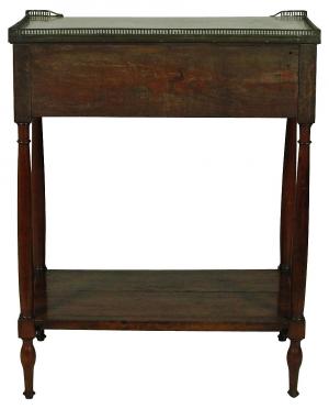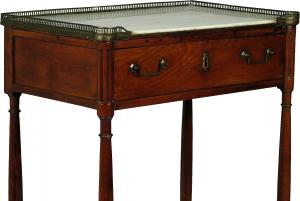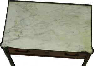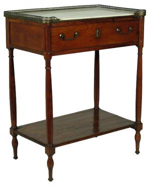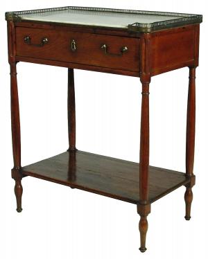 A late 18th-C. French Directoire walnut side table with a single frieze drawer, original brass hardware, and original brass galleried Carrara marble top. 24.25" L x 14.5" D x 30.25" high.