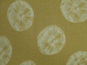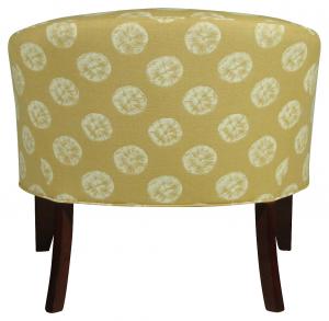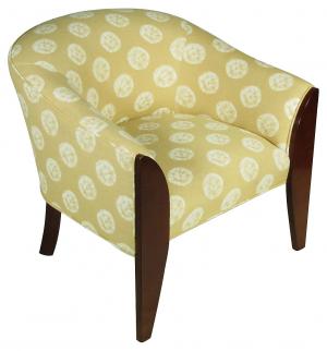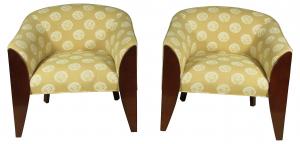 A pair of 1930's Art Deco barrel back club chairs with stained maple frames and new cotton blend Stroheim fabric with sand dollar motif detail. 31.0" W x 31.0" D x 30.5" high. Seat, 19.0" high.