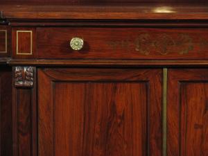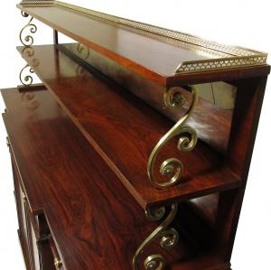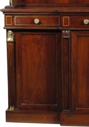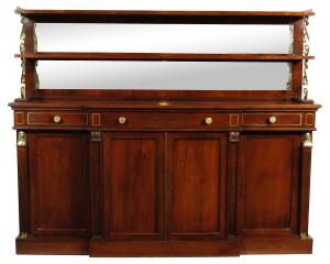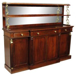 A French Empire-Style rosewood breakfront sideboard with a two-tiered mirrored backsplash, solid brass accents, and a brass inlay. Features a long frieze drawer flanked by short drawers over doored compartments. Doored compartments feature a single removable shelf in each. Mirrored backsplash separates quickly for ease of mobility. Doors function with keyed locks. Key included. 72.0" L x 16.0" D x 58.75" high.