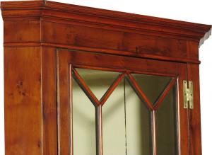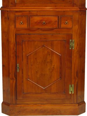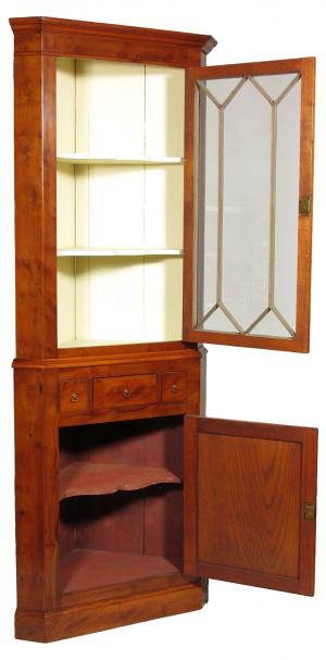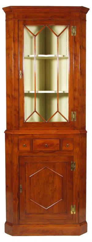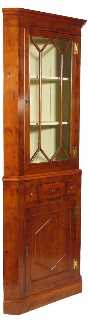 A late 19th-C. English Georgian-Style yew wood corner cabinet with an upper glazed door section fitted with two fixed shelves and a lower section with a central drawer flanked by two false drawers, over a paneled door compartment fitted with a single shelf. Upper and lower sections separate quickly for easier transport. 21" W x 21" D x 81.5" High.