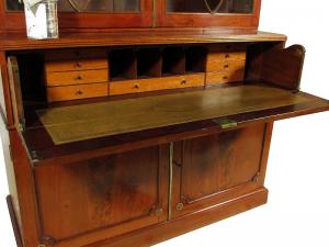 Early 19-C. English George III mahogany secretary bookcase with an upper case fitted with glazed doors and three adjustable shelves, and a lower case which features a secretary drawer with a tooled leather writing surface, and multiple cubbies and mini-drawers, over paneled doors. Paneled doors open to reveal six drawers. Writing surface, 29.5" high. Doors function with keyed locks. Key provided. Upper case and lower case separate quickly for easier transport. Excellent condition.