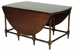 An early 20th-C. Georgian-Style solid mahogany drop-leaf coffee table with hand rubbed lacquer finish by Beacon Hill. Beacon Hill was an early 20th century Boston based maker of luxury furniture goods using only the finest materials and craftsmanship. 46.5" L x 35.0" D x 18.0" High.