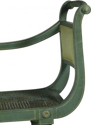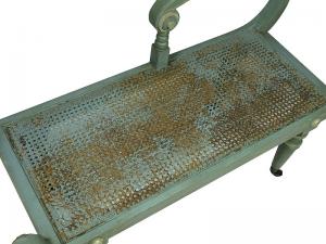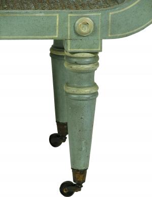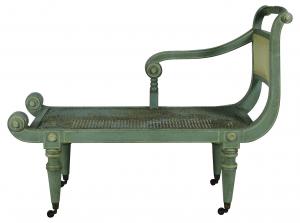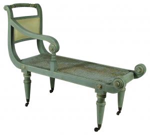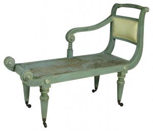A late 19th-C. English Regency-Style child's recamier with original hand-decorated finish, brass casters, and caned seat. Often used with an upholstered cushion. Cushion not included. Seat, 15.25" High. minor surface wear. 18.0" L x 45.0" W x 34.0" High.